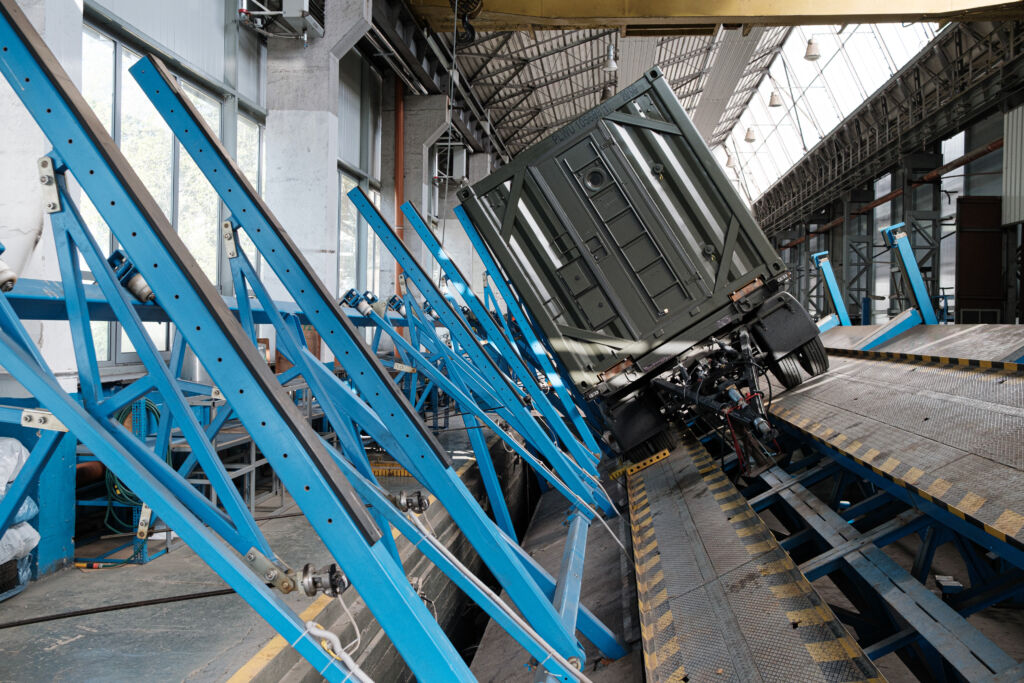 - zespół stanowisk do pomiarów masy, jej rozkładu na poszczególne koła i osie, wyznaczania położenia środka masy, pomiarów jednostkowych nacisków kół na podłoże,